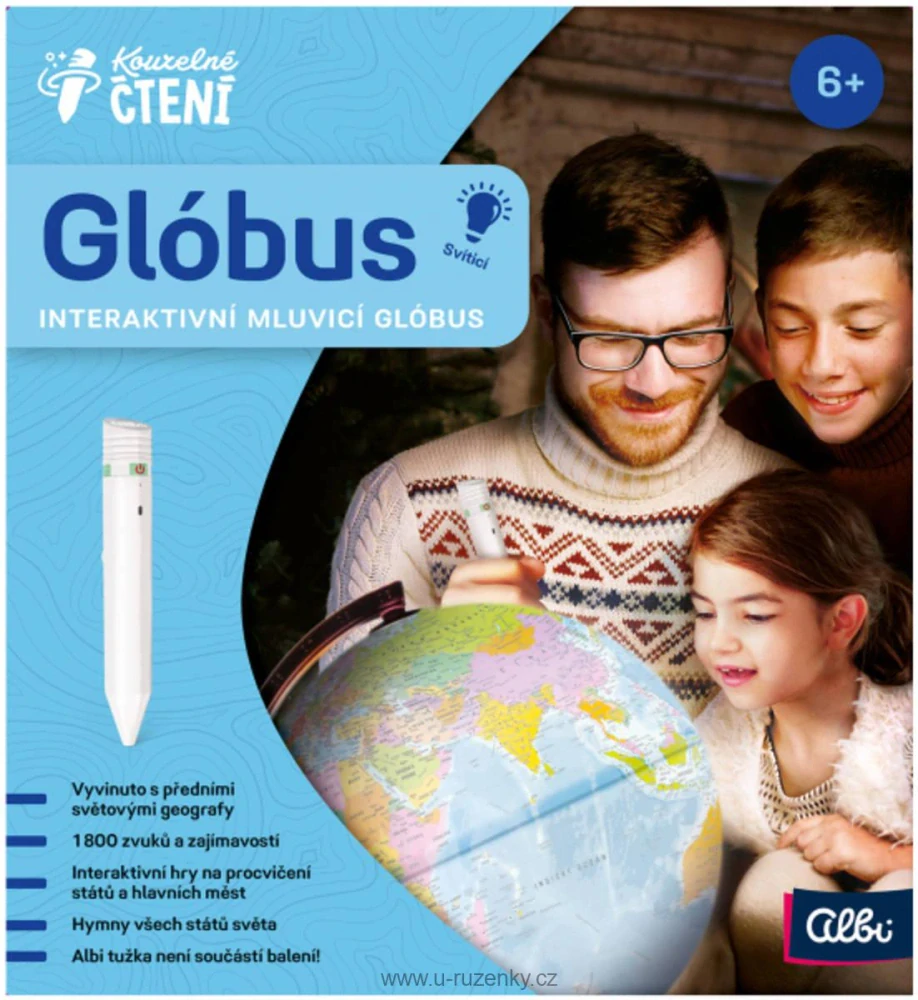 Nejnovější verze interaktivního mluvicího Glóbusu z edice Kouzelné čtení má stabilnější podstavec a jasnější barvy. Glóbus 4.0 funguje s Albi tužkou, s jejíž pomocí můžete interaktivní glóbus rozmluvit a dozvíte se mnoho užitečných a zajímavých informací o téměř 200 zemích světa. Dozvíte se o nich důležitá fakta, hlavní města, něco o dané populaci a politické geografii. Navíc si můžete poslechnout hymnu všech států a spoustu dalších informací. Nechybí zábavné hry a kvízy ve dvou obtížnostech, které ověří získané znalosti. Svíticí glóbus byl vyvinut ve spolupráci s předními odborníky v oblasti geografie. Díky tomu jsou data použitá pro glóbus co možná nejpřesnější a nejaktuálnější.