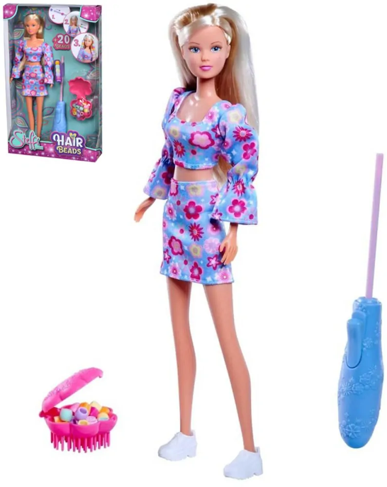 Steffi Love: Hair Beads. Herní set panenka Steffi v kytičkovém dvoudílném outfitu, s háčkem na navlékání korálků do vlasů, s barevnými korálky, gumkou na fixaci a hřebenem s úložným prostorem na korálky.