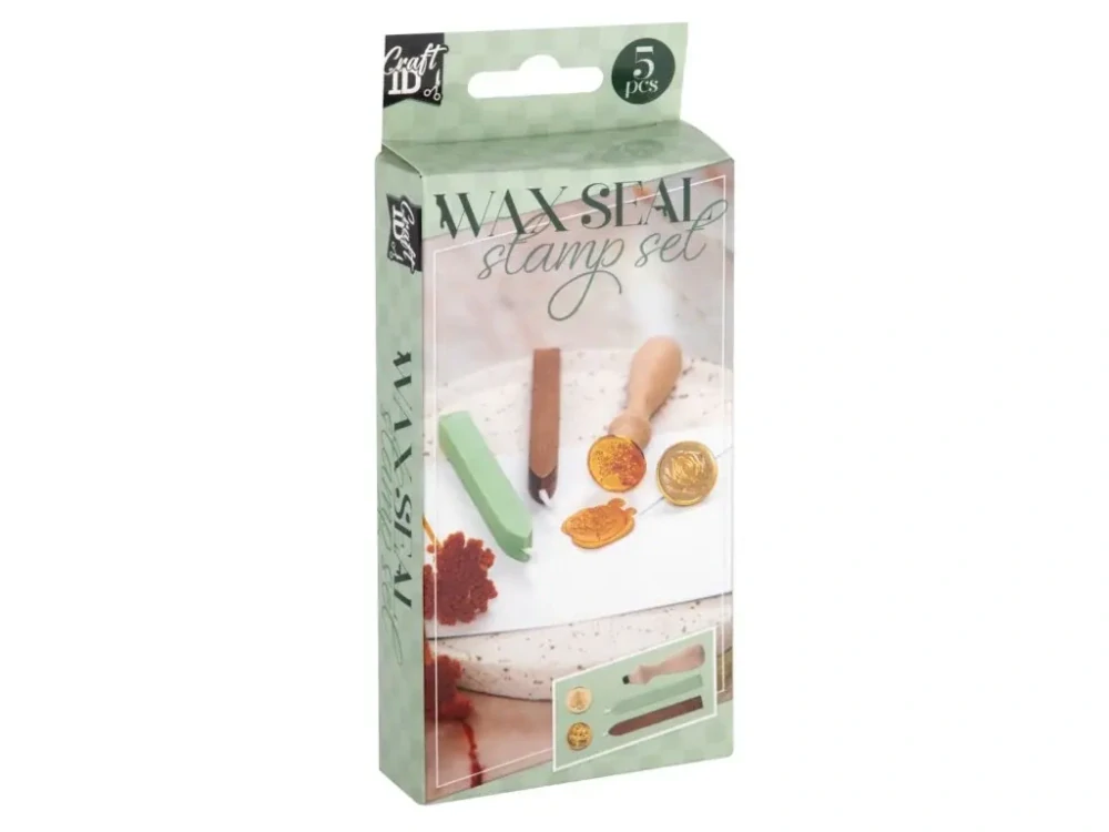 Pečetní souprava obsahuje vše potřebné k pečetění - dvě různá kovová pečetidla, dva barevné vosky, dřevěnou úchytku.