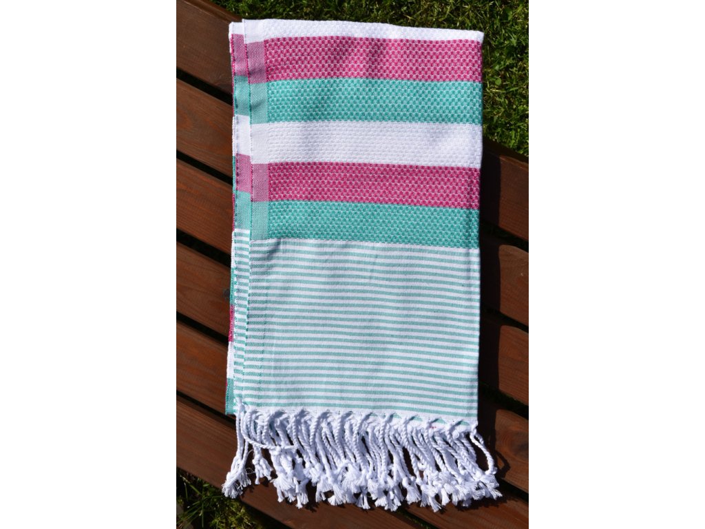 Osuška je s pruhovaným vzorem zelené, bílé a růžové barvy a na jejím konci jsou ručně vázané třásně