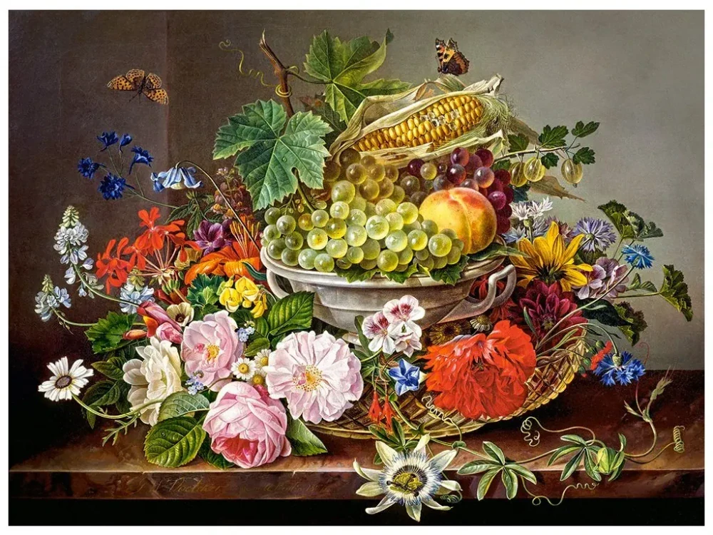 - Barevná harmonie: Živé barvy květin a ovoce vytvářejí působivý vizuální zážitek.