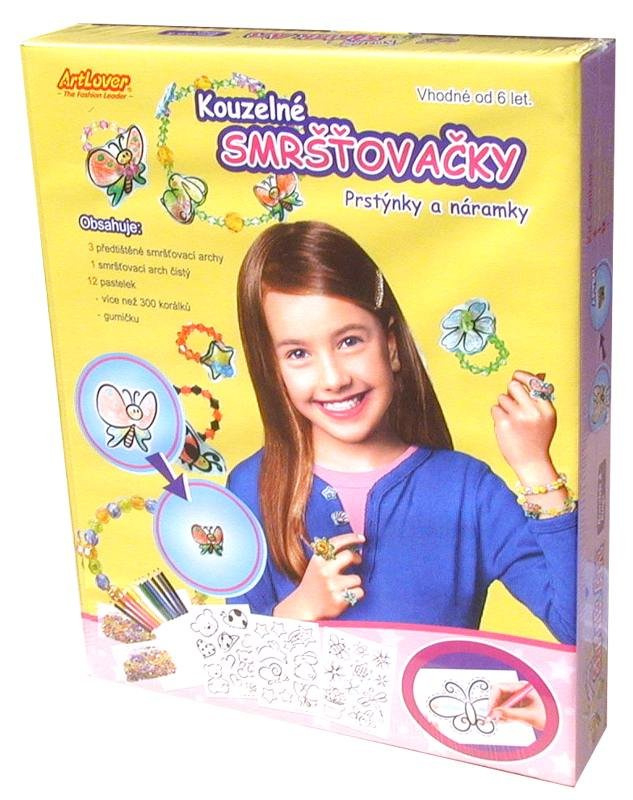 Obrázky namalujete pastelkami, vytřihněte a vložte do předehřáté na 150 stupňů elektrické nebo horkovzdušné trouby na 2 minuty. Obrázek se začne zmenšovat a zpevňovat. Když zůstane beze změn, opatrně vyndejte z trouby. Sada obsahuje 3 archy s předtištěnými obrázky, 1 arch čistý, 12 pastelek, přes 300 korálků, gumičku.