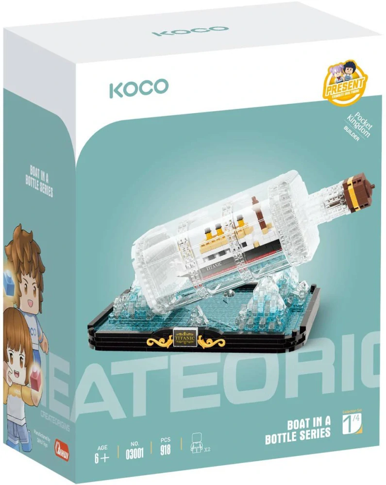 Stavebnice KOCO, to jsou velké příběhy v malých detailech. Sestavte si krásný model Titanicu v láhvi. Skvělý tip pro procvičení jemné motoriky rukou. Balení obsahuje podrobný obrázkový návod.