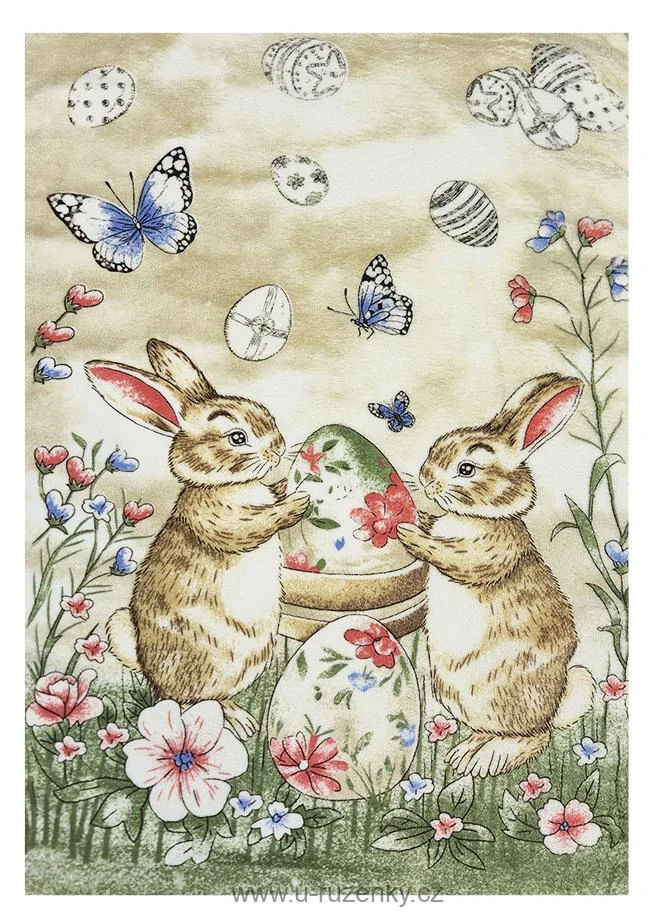 Kvalitní kuchyňská utěrka na nádobí z mikrovlákna s velikonočním motivem dvou zajíčků a krásných kraslic na béžovém podkladu doplněny motýlky a lučním kvítím.